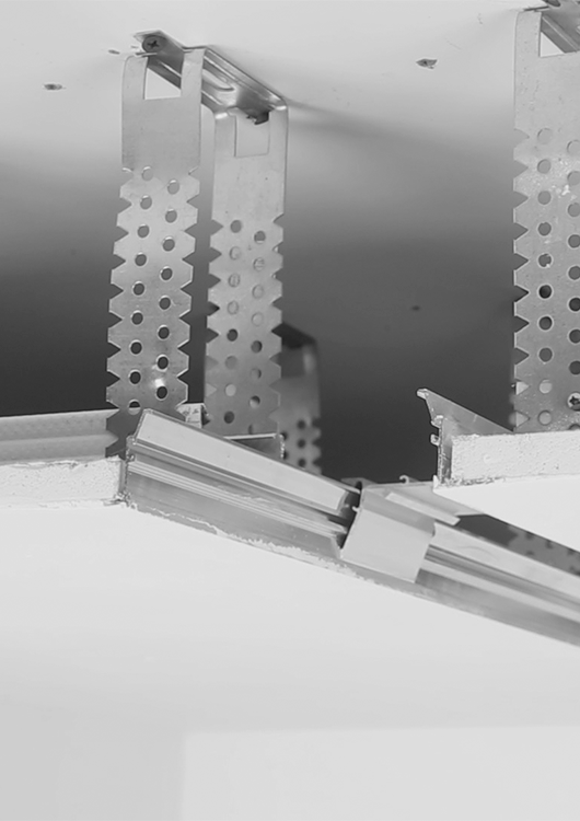 The profile can be mounted "from below" allowing to build ceiling lighting fixtures that run "wall to wall"